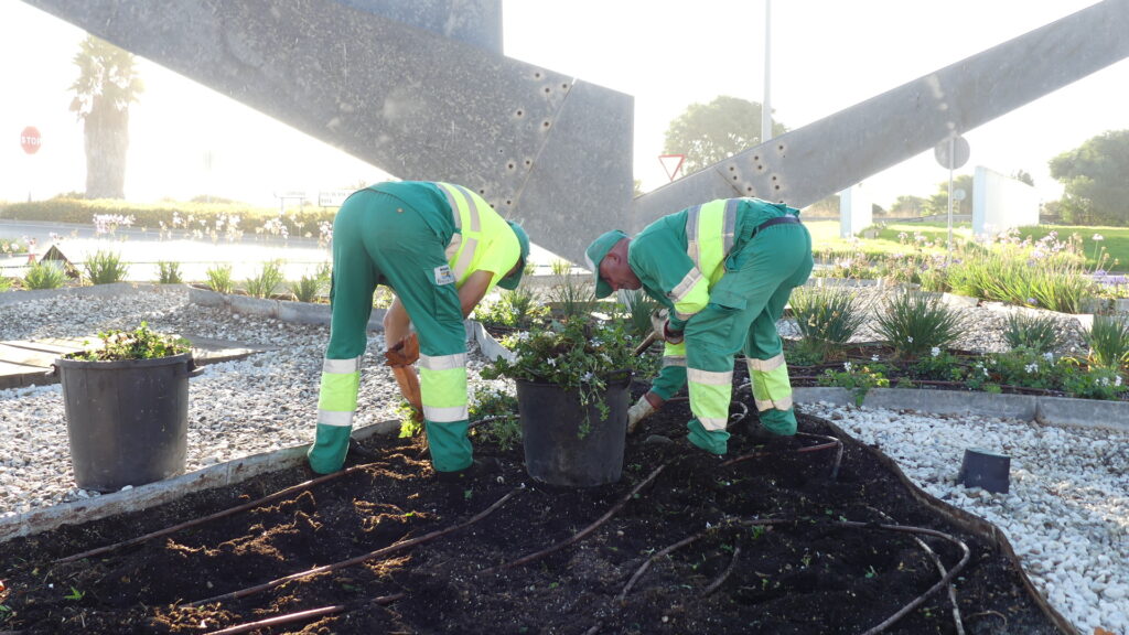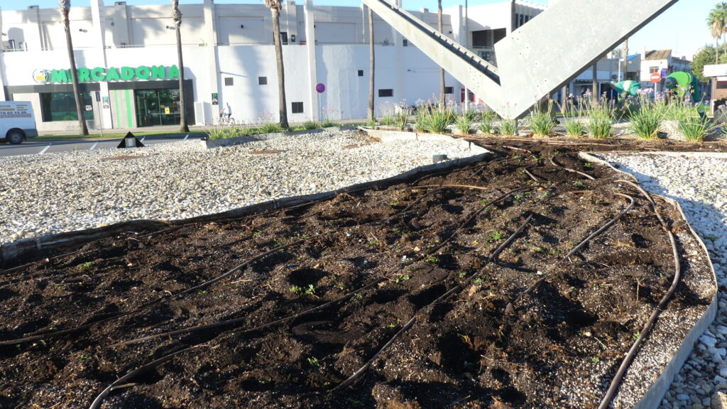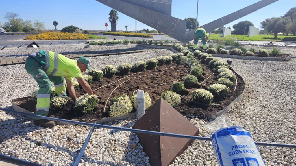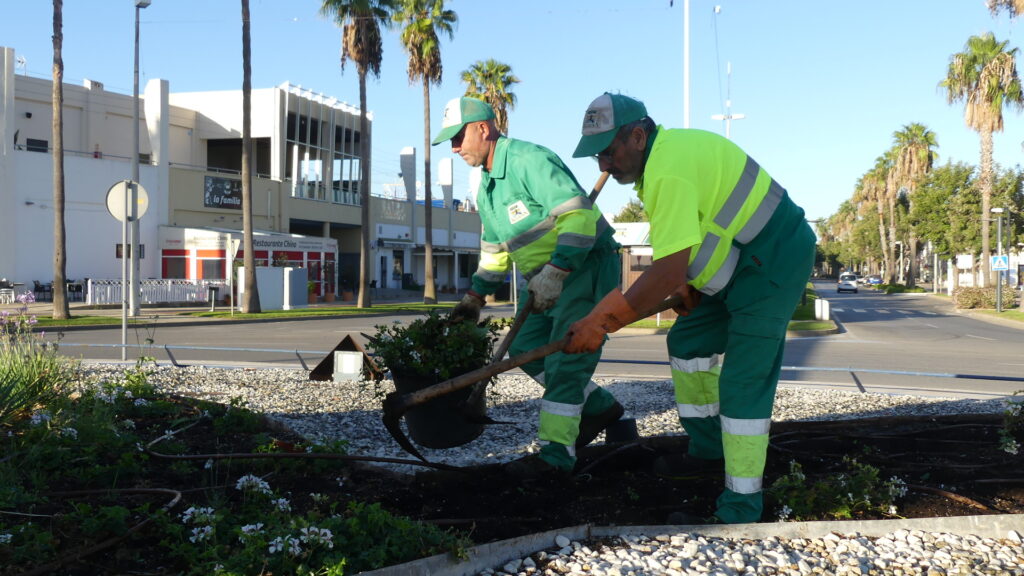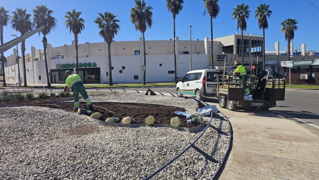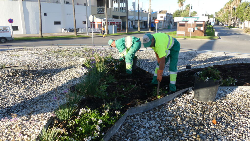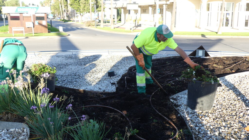 En la rotonda de entrada por la avenida Juan Carlos I, los trabajadores de la EUC están preparando los espacios verdes para plantar margaritas, abonando el terreno y controlando el riego, acción que se repetirá en parterres situados en calles, avenidas y parques para los que se usarán otras especies propias de la temporada actual. Gracias a estos trabajos, que son habituales, se contribuye a que Costa Ballena luzca un aspecto cuidado, bien con plantas propias del invernadero de la Entidad, o adquiridas a un proveedor externo.