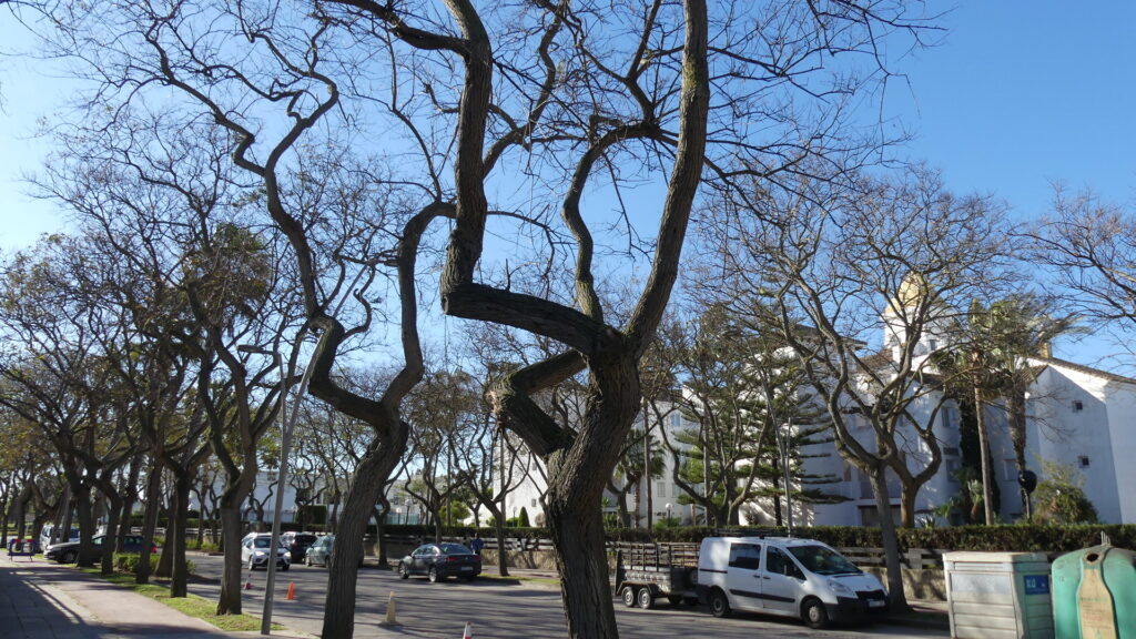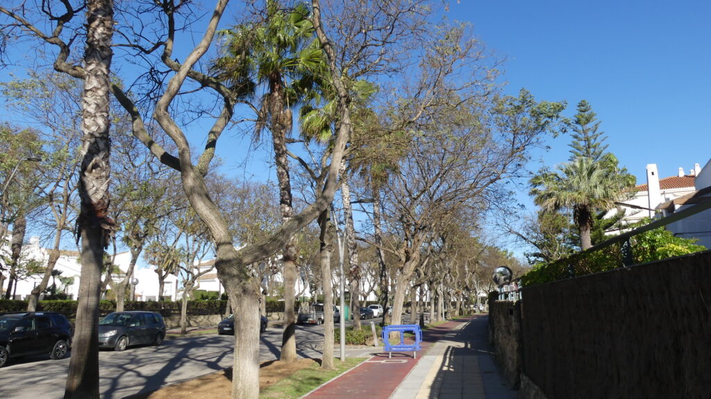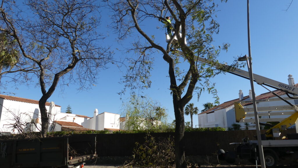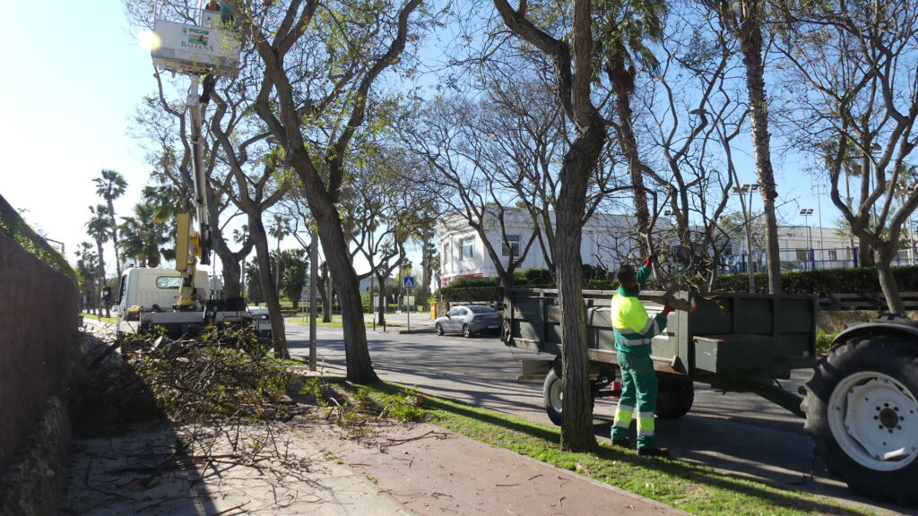 Las labores de jardinería que lleva a cabo a diario la EUC de Costa Ballena, que son numerosas y variadas debido a las amplias extensiones de zona verde y la cantidad de arbolado que hay en el complejo urbanístico, incluyen en este mes de marzo la poda de tipuanas en la avenida Reina Sofía.