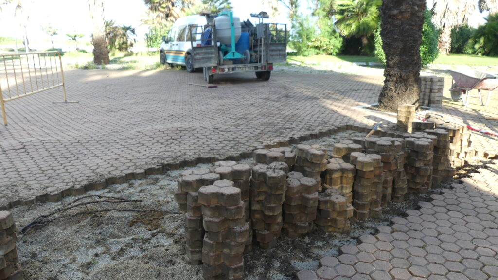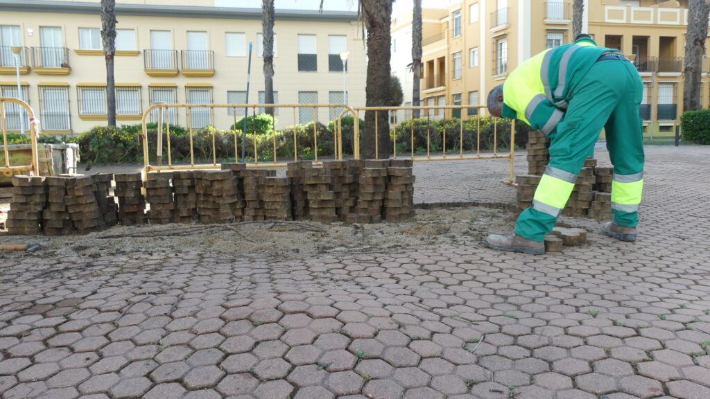 Los trabajadores retiran en primer lugar los adoquines para pasar a eliminar las raíces que provocan el problema; posteriormente, se estabiliza el terreno y se recoloca la solería que se reutiliza en su totalidad. Para completar la actuación, se aumenta el perímetro de los alcorques de modo que la palmera tiene más espacio para seguir creciendo y se evita que las raíces vuelvan a levantar el pavimento.