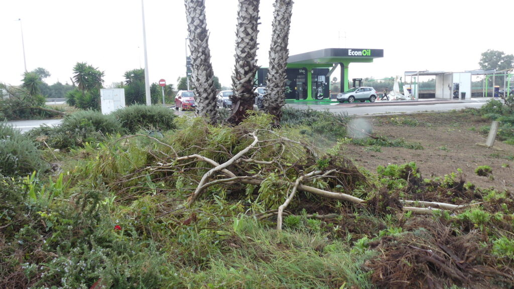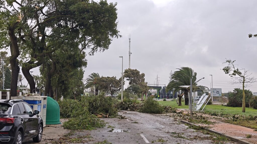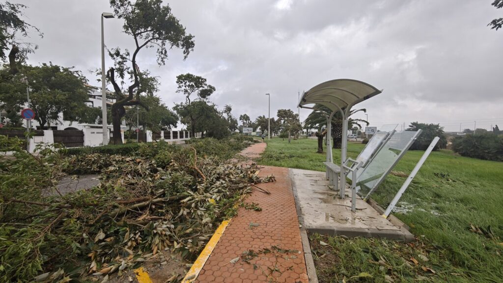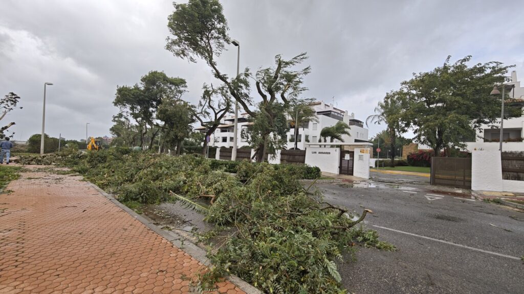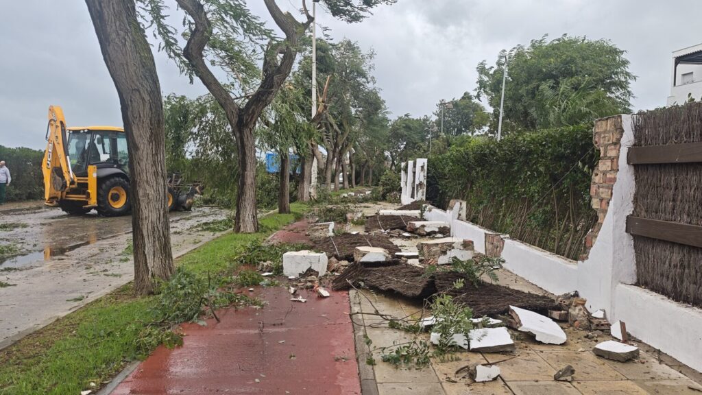 29 de octubre de 2025El paso de una manga marina (similar a un tornado), que ha tocado tierra durante la pasada madrugada, ha dejado importantes destrozos en Costa Ballena, la mayoría localizados en la avenida Carla de Orleans que ha sufrido no solo daños en el arbolado, que han sido los más numerosos, sino también en el cerramiento de alguna comunidad de propietarios, instalaciones deportivas, en la gasolinera de la entrada , señales de tráfico e incluso en la marquesina del autobús.
