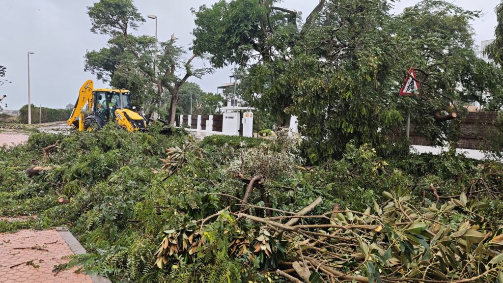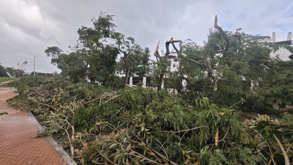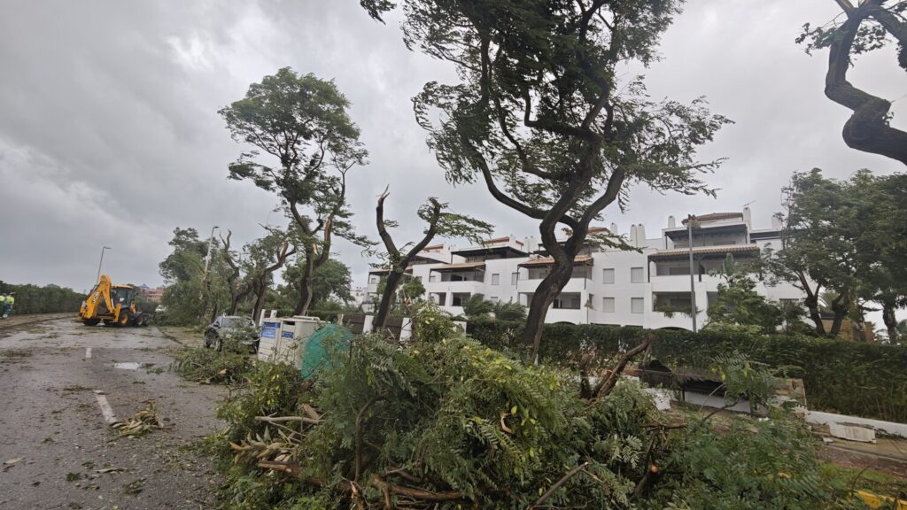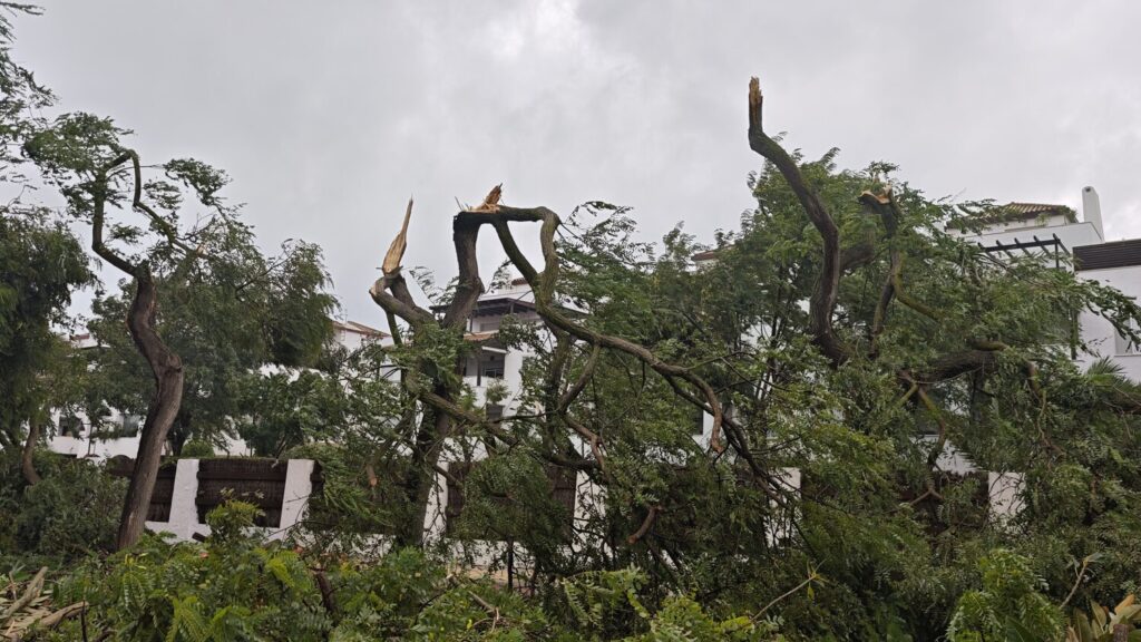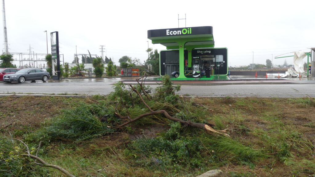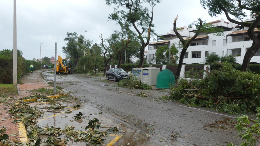 29 de octubre de 2025El paso de una manga marina (similar a un tornado), que ha tocado tierra durante la pasada madrugada, ha dejado importantes destrozos en Costa Ballena, la mayoría localizados en la avenida Carla de Orleans que ha sufrido no solo daños en el arbolado, que han sido los más numerosos, sino también en el cerramiento de alguna comunidad de propietarios, instalaciones deportivas, en la gasolinera de la entrada , señales de tráfico e incluso en la marquesina del autobús.