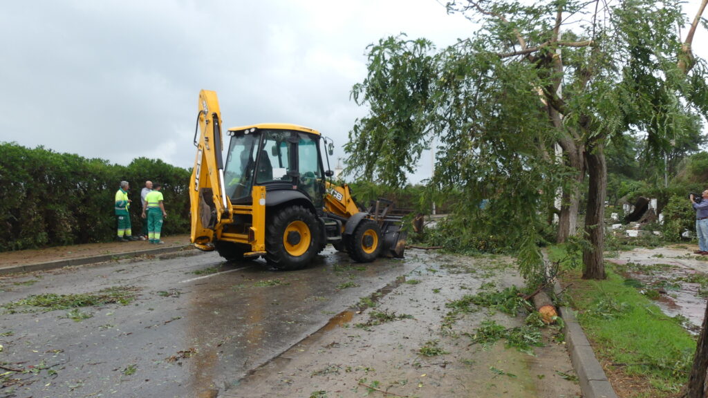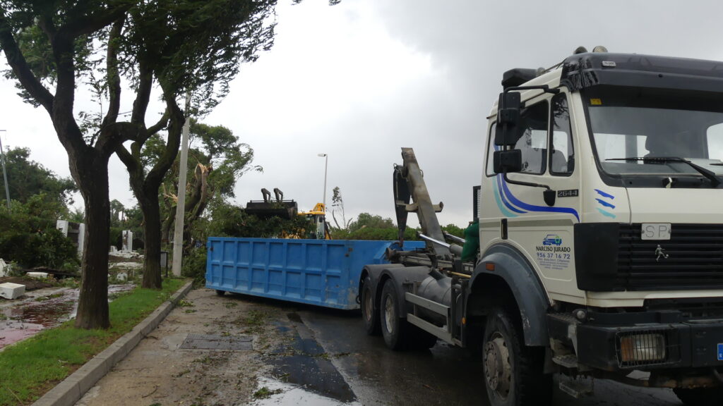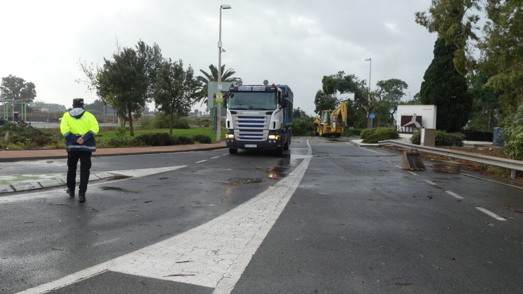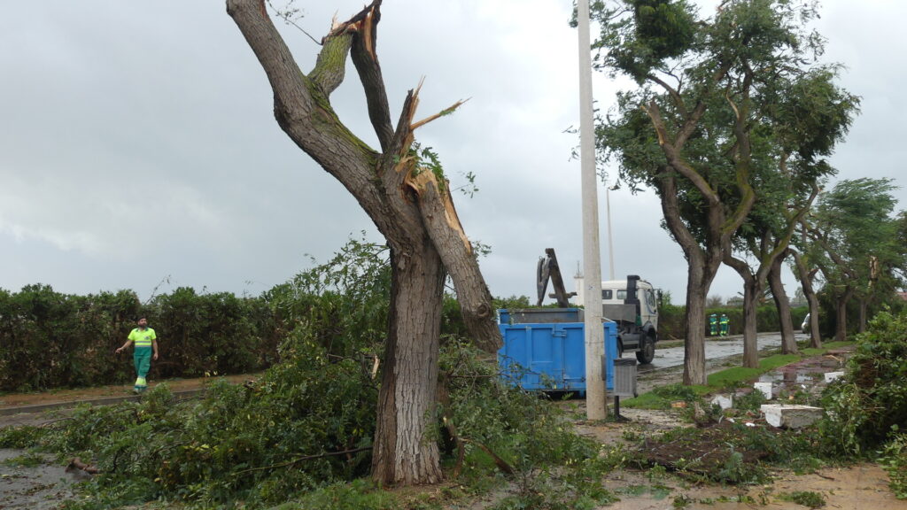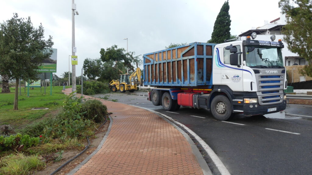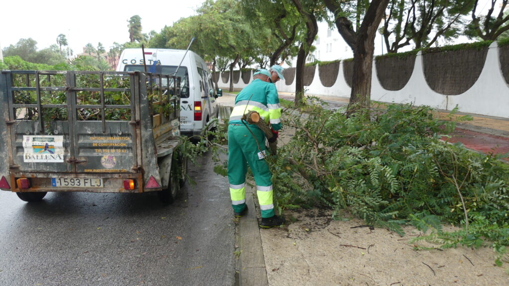Tras el paso de la manga marina se han podido ver los numerosos árboles afectados, la mayoría, con ramas tronchadas o a punto de hacerlo, lo que genera una situación de peligro que ha llevado desde primera hora a la EUC, en coordinación con la delegación de Parques y Jardines del Ayuntamiento de Rota, a actuar de forma inmediata, asegurando todos aquellos ejemplares que se han visto dañados.